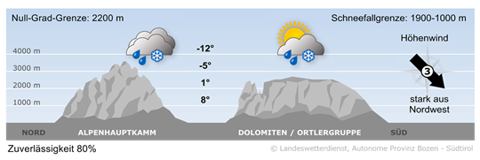 Der Regen hat nachgelassen und Nordföhn trocknet die Luft ab. Im Vinschgau und in den südlichen Landesteilen sind auch ein paar Auflockerungen möglich. Am späten Nachmittag und Abend ziehen von Norden her noch einmal ein paar Schauer durch. Gleichzeitig sinkt die Schneefallgrenze mit böigem Nordwind gegen 1000 m. Die Temperaturen erreichen Höchstwerte von 9° in Bruneck und Sterzing bis 13° in Bozen und Meran.