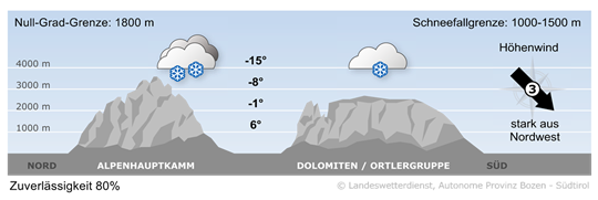 Die Wolken nehmen zu und im Norden Südtirols beginnt es zu regnen bzw. schneien, die Schneefallgrenze steigt auf 1100-1400 m. Am Nachmittag und Abend können die Niederschläge zeitweise auch weiter in den Süden übergreifen, vor allem ins Pustertal und auf die Dolomiten. Im Vinschgau ist es weiterhin föhnig. Die höchsten Temperaturen liegen zwischen 5° und 13°.
