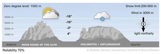 In the afternoon, it will be dry across most of the region, with clouds clearing in places. The last snow showers in the eastern Dolomites will subside. Temperatures in the afternoon will range between 2° and 7°.