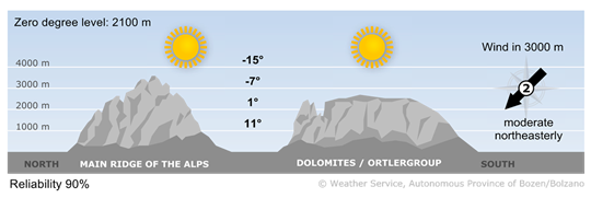 The day will start sunny and cloudless across the region. In the evening that a few high clouds will appear from the north. After early morning temperatures of around 0°C, temperatures will rise to highs of 12°C in the Wipptal valley and up to 18°C in the Unterland.