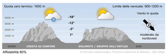 Sui monti dell'Alto Adige il tempo sarà soleggiato a tratti per il passaggio di nuvolosità anche intensa. Venti in attenuazione e temperature in contenuto aumento.