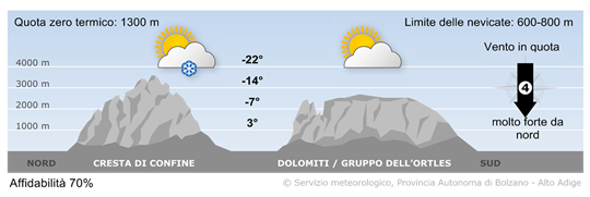 In montagna si alterneranno sole e nubi. Sulla cresta di confine gli annuvolamenti saranno più consistenti con visibilità a tratti ridotta. Temperature in aumento.