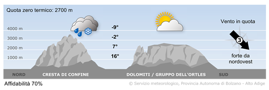 Sui gruppi settentrionali la nuvolosità tenderà ad aumentare rapidamente con deboli precipitazioni sulla cresta di confine. Limite della neve sui 2000 m. A sud il tempo sarà soleggiato a tratti con lieve aumento della probabilità di rovesci nel pomeriggio.